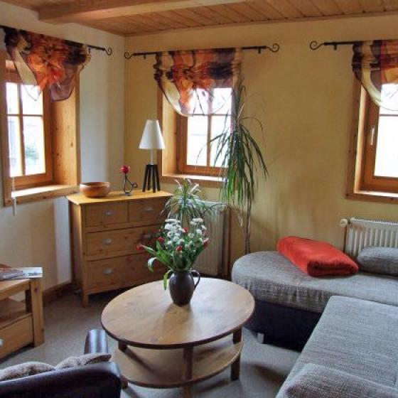 Das Wohnzimmer ist ausgestattet mit SAT-TV, Video, Telefon und HiFi-Anlage. Die Schlafcouch bietet Ihnen eine alternative Übernachtungsmöglichkeit. Sie wurde entsprechend den Kriterien des Deutschen Tourismusverband mit 4 Sternen ausgezeichnet.