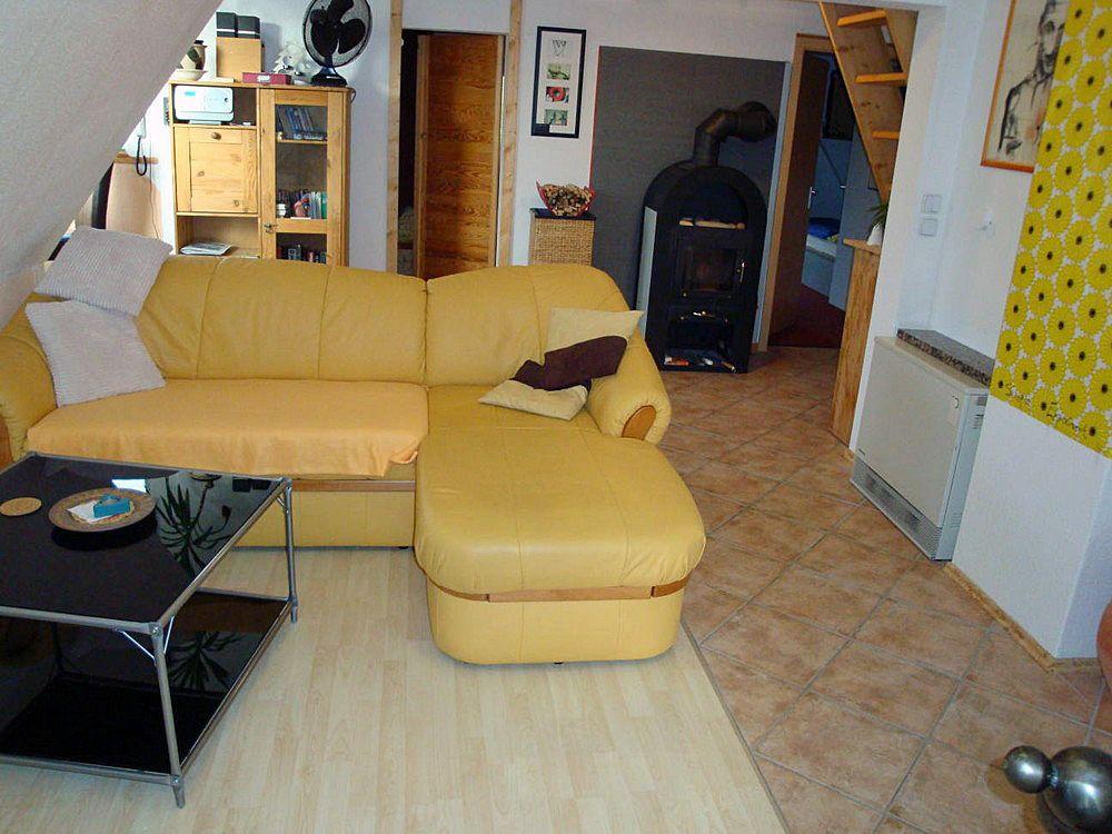 Die Ferienwohnung "KunterGrün" 2 (K2) ist 50 qm groß und bewusst für nur zwei Personen gedacht, das garantiert viel Platz und macht den Urlaub aus. Neben Wohnzimmer, großer Küche, Schlafzimmer, Flur und Bad gibt es direkt vor der Tür eine überdachte Terrasse. Telefon, W-Lan, Waschmaschine und Kaminofen gibt es in der "K2" natürlich auch. Außerdem kleine Wiese hinterm Haus mit Gartenhütte - prima zum Grillen oder Rumliegen. |