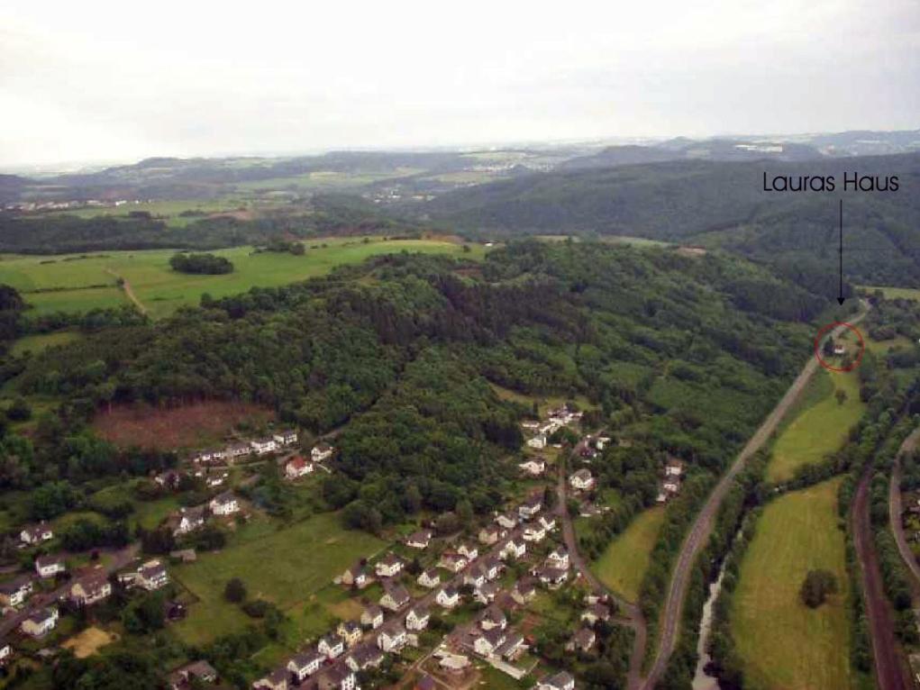 Unser Ferienhaus liegt etwa 800m außerhalb des Ortes, in absoluter Alleinlage auf einem 1200 qm großem Grundstück mit angrenzendem mit nutzbarem großem Wiesenland direkt an der Kyll. |
