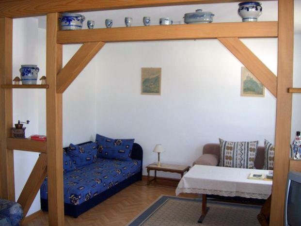 FeWo 1 "Große Barbara" mit ca. 80 qm bietet die Ferienwohnung über 2 Etagen verteilt im 1. und im 2.Stock Übernachtungsmöglichkeit für bis zu 6 Personen. (1 Wohn-Schlafraum - 1 Schlafzimmer - 1 Kinderzimmer - 2 Badezimmer - 1 Küche - 1 Doppelbett - 1 Einzelbett - 1 Hochbett - 1 Schlafcouch - 1 Studioliege - 1 Babyreisebett).